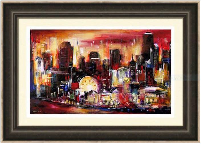 This Chicago art framed print, "Navy Pier Sunset" is from an original Chicago skyline cityscape painting by artist Kathleen Patrick, and provides a dynamic view of Chicago, that displays beautifully in any room. The artist was chosen "Artist of the Year" by the Chicago Convention and Tourism Bureau based on her colorful and imaginative portrayals of the great city of Chicago.